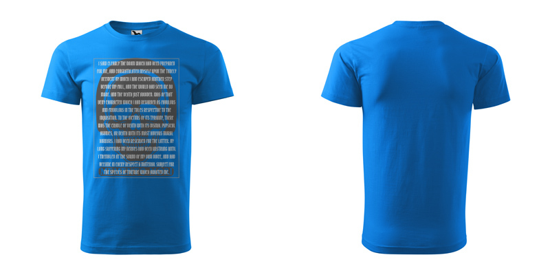 Krátký rukáv, 100% bavlna, gramáž 160 g/m2, tubulární střih, úzký lem průkrčníku z žebrového úpletu s 5 % elastanu, zpevňující páska od ramene k rameni, silikonová úprava. Barva: modrá.